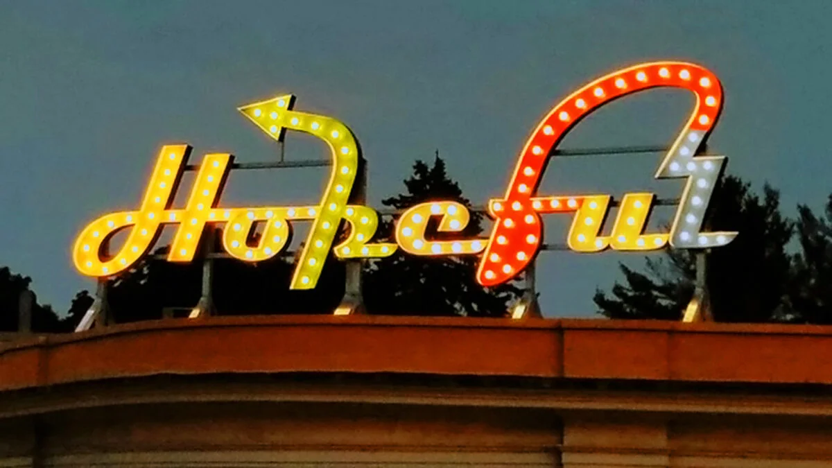 Hewitt’s “Hopeful” installation, illuminated at dusk.